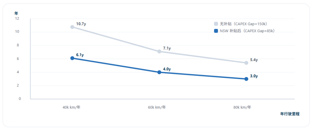 0 2 4 6 8 10 12 40k km/年 60k km/年 80k km/年 年行驶里程 10.7y 7.1y 5.4y 6.1y 4.0y 3.0y 无补贴(CAPEX Gap=150k) NSW 补贴后(CAPEX Gap=85k)