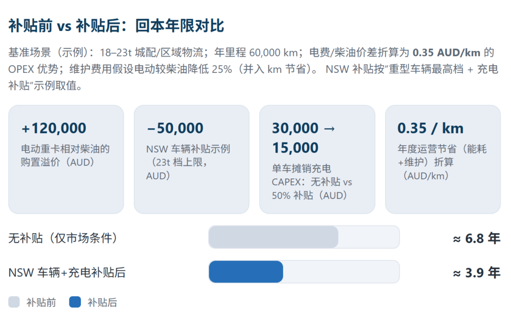 NSW的这轮补贴设计相对落地,核心目标是降低企业换电动车的真实决策门槛。政府第一次明确承认:电动重卡是“该被补贴的基础设施型资产”。