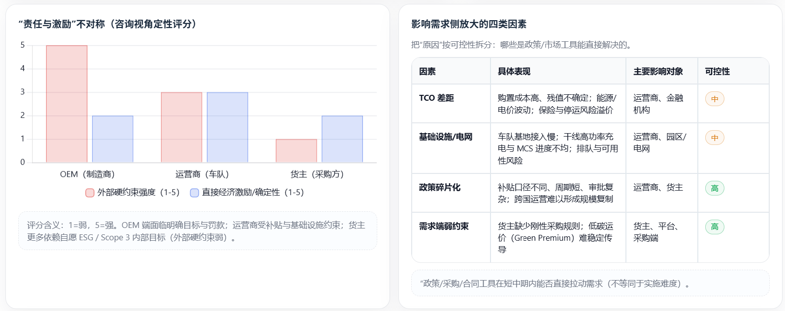 评分含义:1=弱,5=强。OEM 端面临明确目标与罚款;运营商受补贴与基础设施约束;货主更多依赖自愿 ESG / Scope 3 内部目标(外部硬约束弱)。