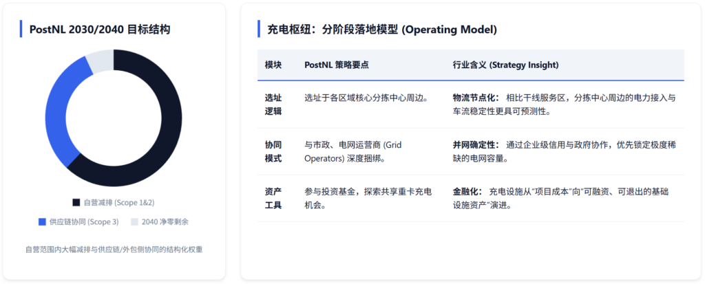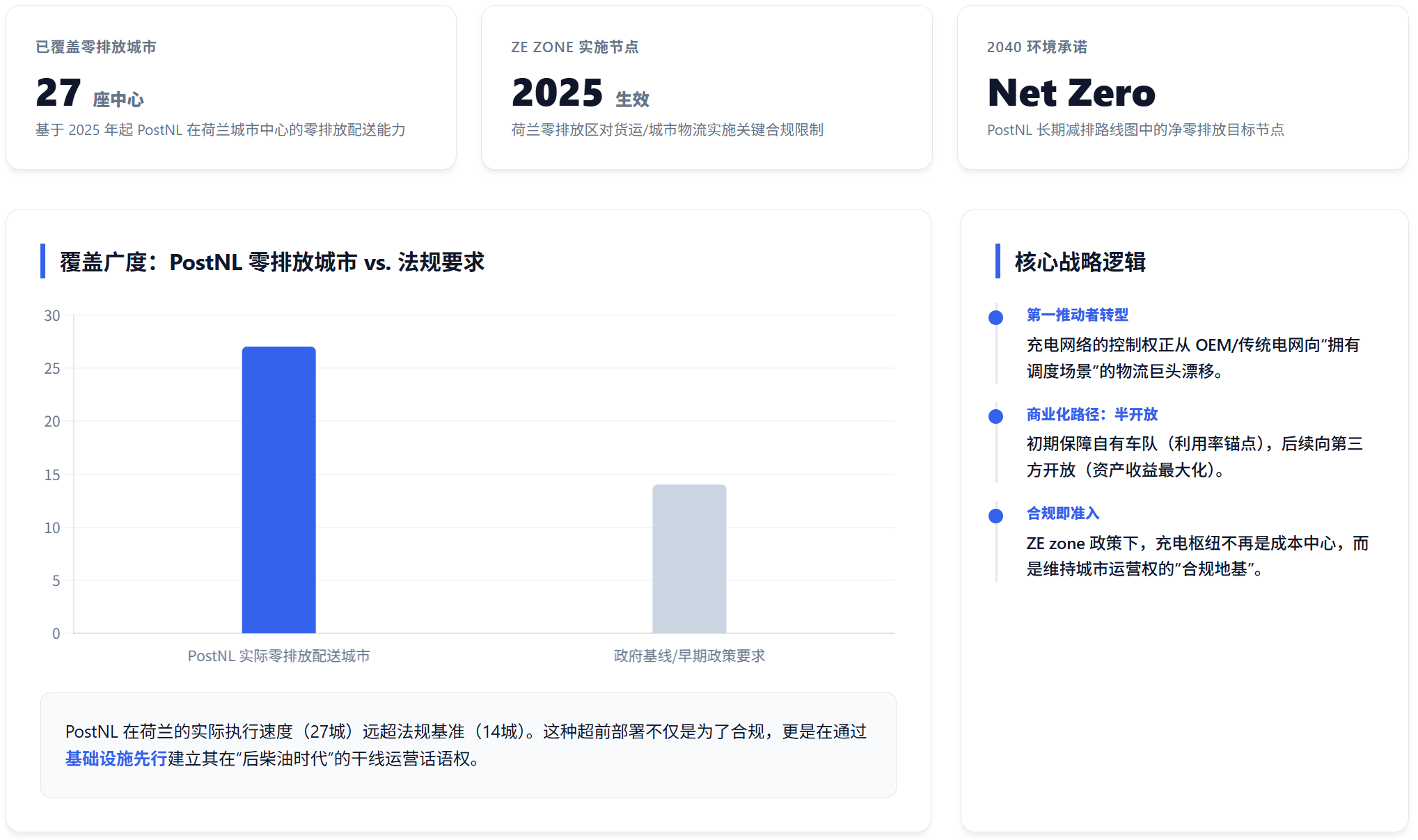 从官方目标看,PostNL 计划到 2030 年将自身运营排放降低 90%,供应链降低 45%,2040 年实现净零。通过与地方政府、电网运营商、物流伙伴联合建设,并参与相关投资基金,PostNL 正在把自己从“物流用户”,推向零排放物流基础设施的节点型参与者。在欧洲的制度环境中,关键公共资源更愿意向“开放型项目”倾斜某种程度上,这是一次从物流公司到系统参与者的角色升级。