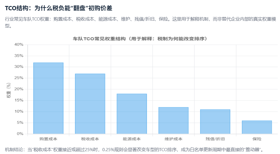 机制结论:当“税收成本”权重接近或超过25%时,0.25%规则会显著改变车型的TCO排序,成为白名单更新周期中最直接的“推动器”。