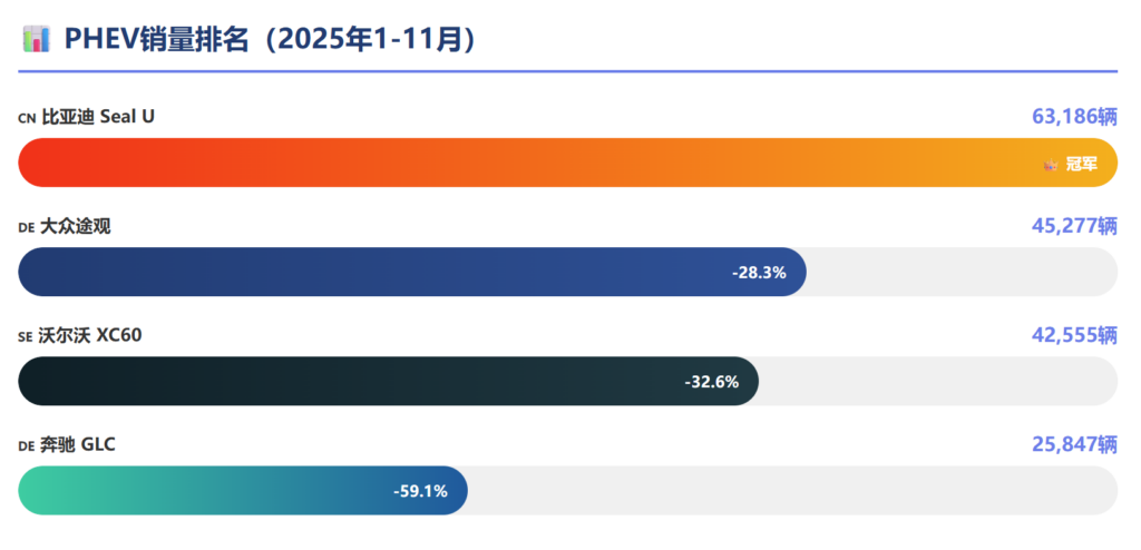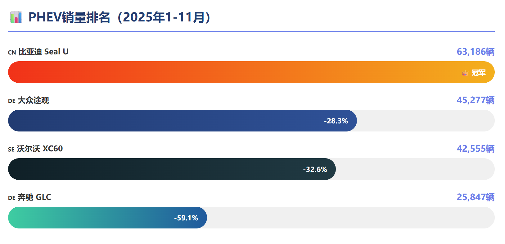 2025年11月,比亚迪 Seal U PHEV 以 63186 辆的累计销量,登顶欧洲插电混动(PHEV)市场,将长期占据该细分市场王座的大众途观拉下神坛。
