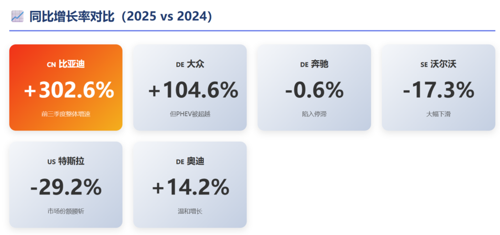 这是中国品牌首次在欧洲新能源细分市场实现“累计销量第一”。销量登顶而且不是靠补贴。特斯拉在欧洲市场销量同比下滑 29.2%,奔驰陷入零增长区间,沃尔沃同比下跌 17.3%,比亚迪却在欧洲市场实现302.6%的同比增长。