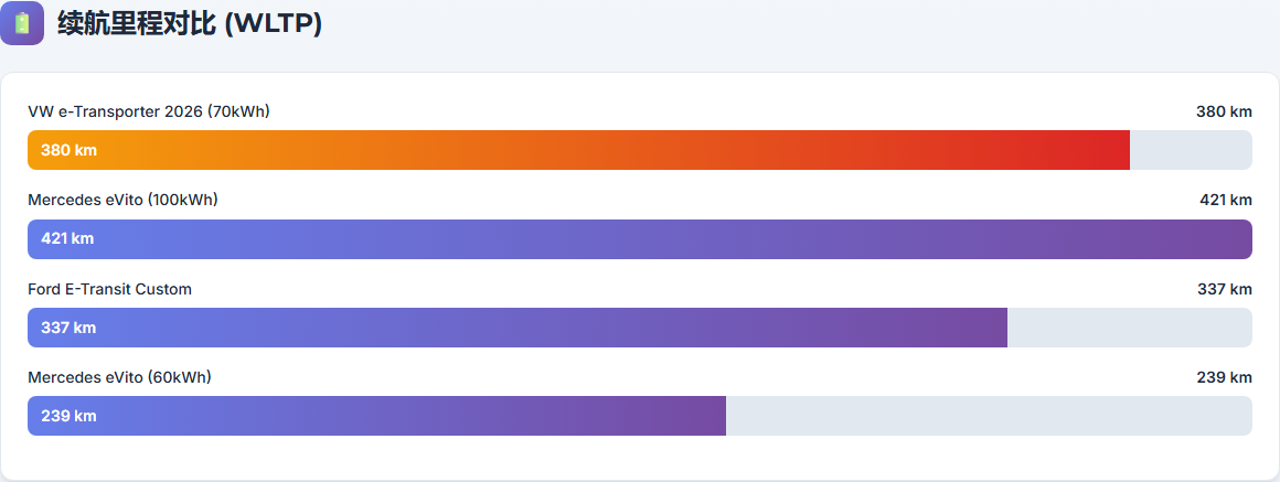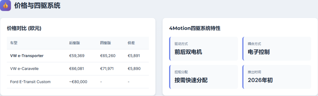 大众的e-Transporter起价€59,369.10,四驱版€65,259.60,价差约€5,890。这一价差对应的是四驱系统带来的场景扩展—从城市铺装路面到建筑工地、非铺装路面,车辆可进入的运营场景显著增加。对比竞品:福特E-Transit Custom续航337公里,奔驰eVito提供60kWh/100kWh两个版本(239-421公里)。