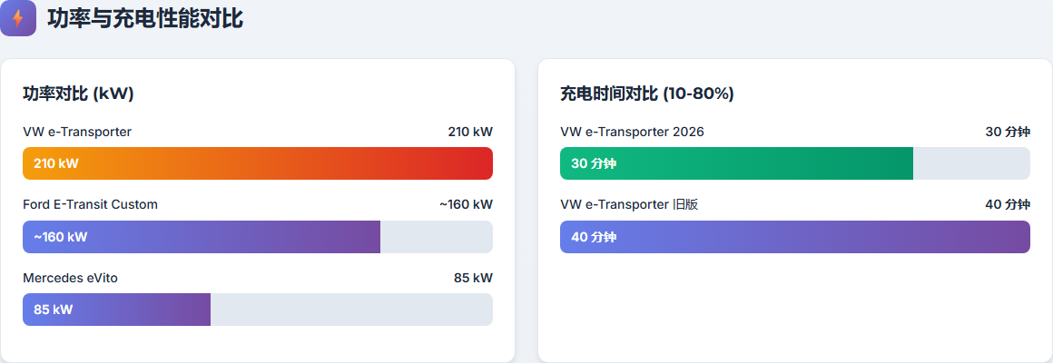 三档功率可选:100kW、160kW、210kW。210kW版本功率达218马力,在同级电动货车中功率最高。对比福特E-Transit Custom和奔驰 eVito(136马力),大众在功率方面保持领先。