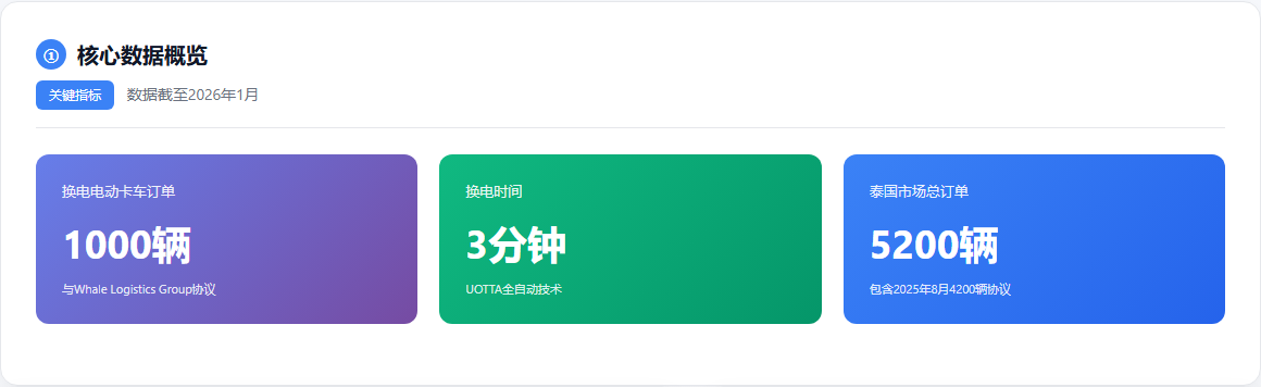 中国换电技术正在东南亚加速落地。U Power与泰国Whale Logistics Group签署战略合作协议,将在泰国部署最多1000辆换电电动卡车牵引车,首批30辆将于2026年4月交付。这是继2025年8月4200辆电动重卡协议后的又一订单,换电时间仅需3分钟。