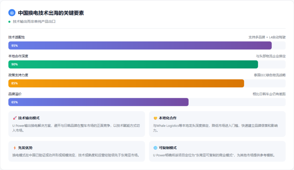 U Power的案例显示了中国技术企业出海的新路径:技术输出而非单纯产品出口,与当地龙头深度绑定,换电模式在中国已验证成功因此具备先发优势。
