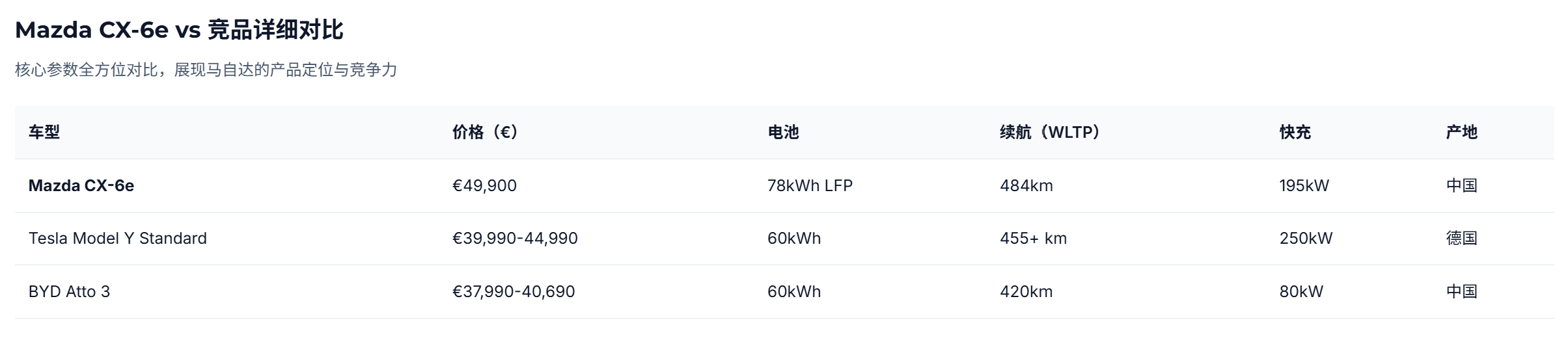 马自达Mazda确认将在中国生产的电动SUV以CX-6e车型导入欧洲,德国起售价49990欧元,今年夏天进入经销商体系。显示出中国制造正在被更多全球品牌”拿来即用”,欧洲竞争从品牌战转向体系战。