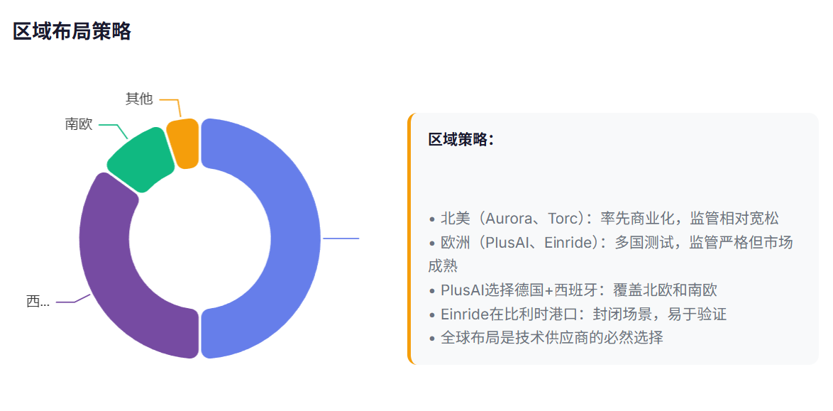 由此可见,技术供应商+OEM的合作模式成为主流。PlusAI与依维柯、Aurora与大陆集团、Torc Robotics与戴姆勒卡车,都是这种模式的体现。科技公司提供自动驾驶解决方案,传统OEM提供车辆制造能力和市场准入,双方优势互补。PlusAI、Aurora都是美国公司,但都在欧洲积极布局。包括乘用车领域的特斯拉Autopilot、Waymo显示出美国自动驾驶技术正在向全球扩张。