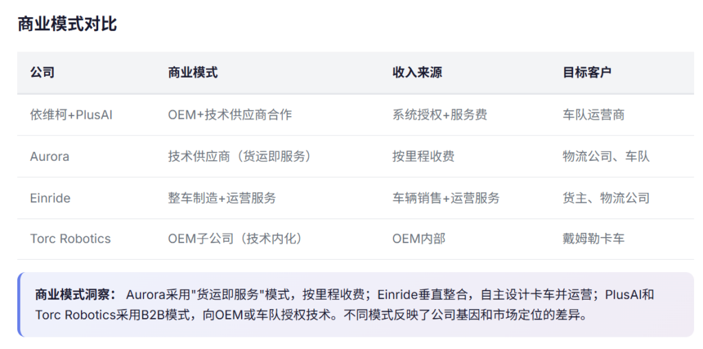 从目前进度看,技术方面进展较快,PlusAI的SuperDrive系统已经在德国和西班牙完成测试。监管方面,欧盟正在推进相关法规制定,但各国落地时间表不一。商业模式方面,长途货运是最先可能实现商业化的场景,因为高速公路路况相对简单,且车队运营方有明确的成本压力。商用车的自动驾驶只有当技术、监管、商业模式三者都到位时,从测试到商业化的转换会更快。