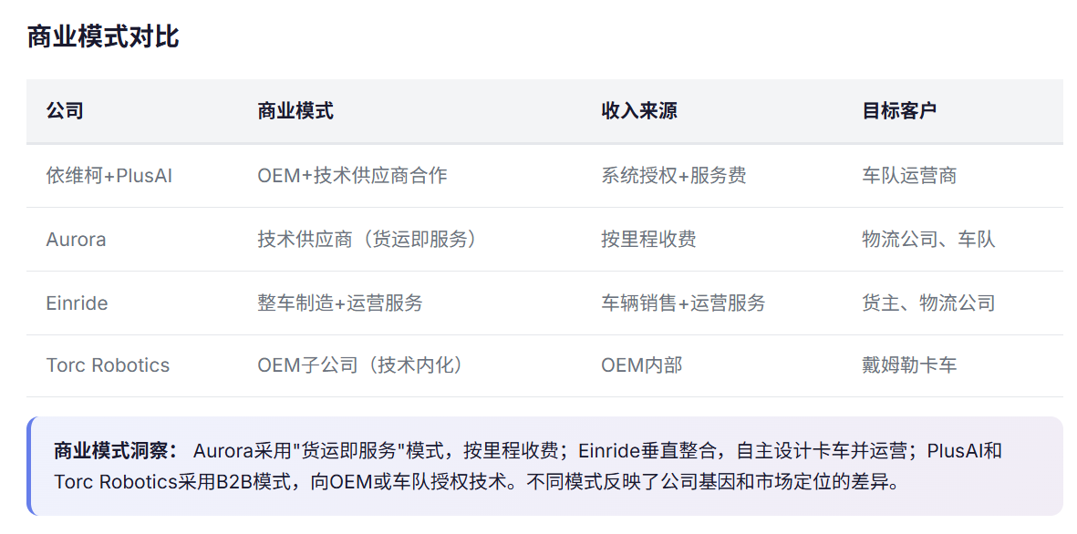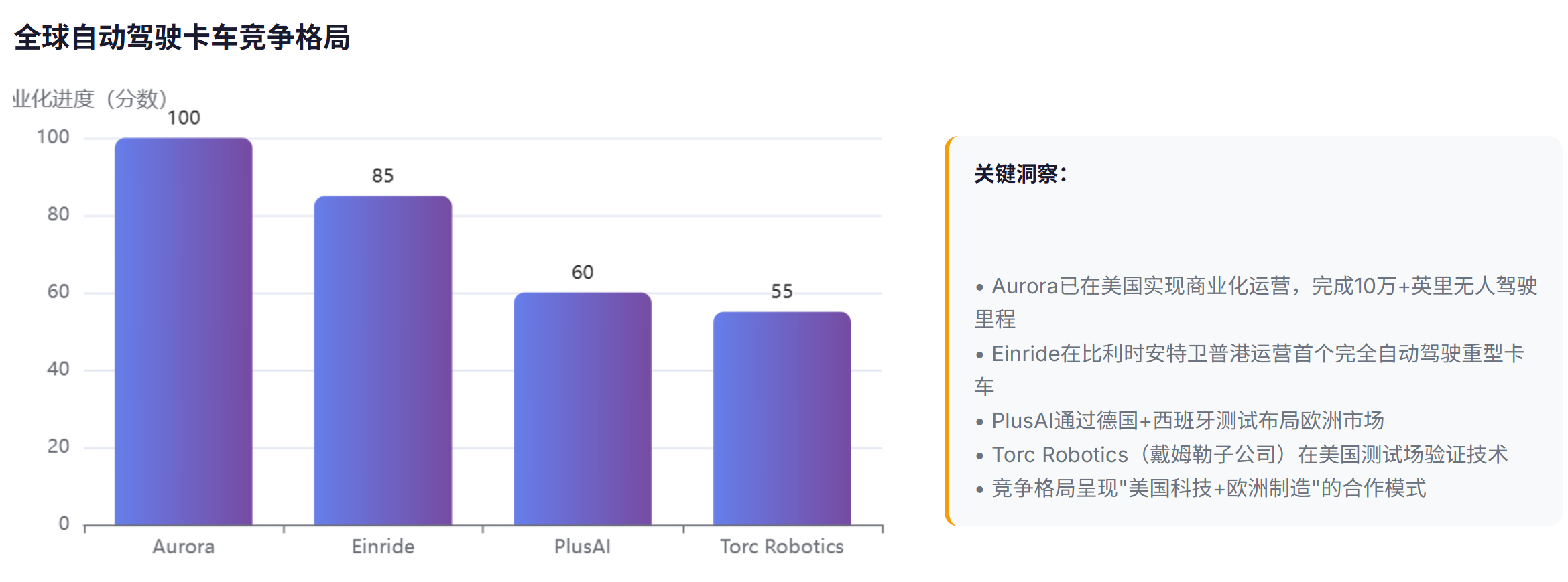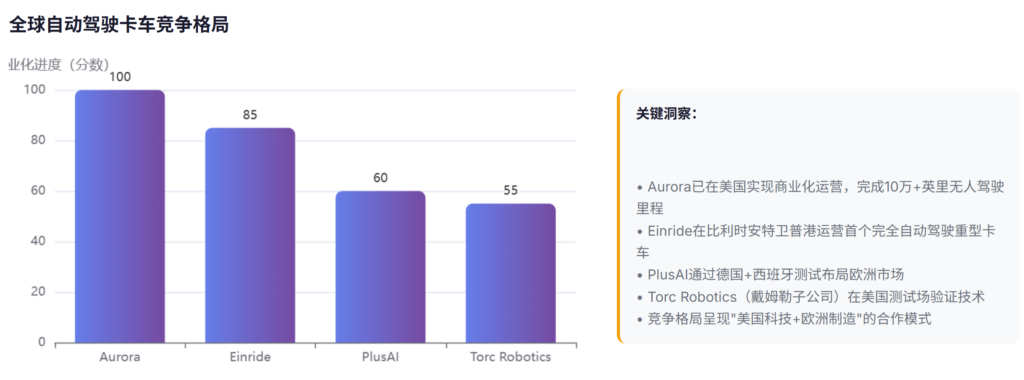 目前公开信息中,中国自动驾驶卡车领域的进展,例如主线科技、图达通、智加科技等中国公司在国内已经开展Level 4自动驾驶卡车测试,部分技术方案在特定场景下已经达到商业化水平。