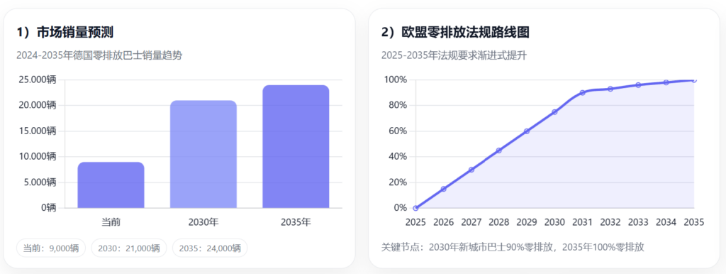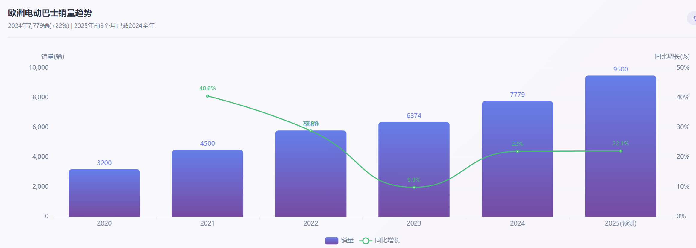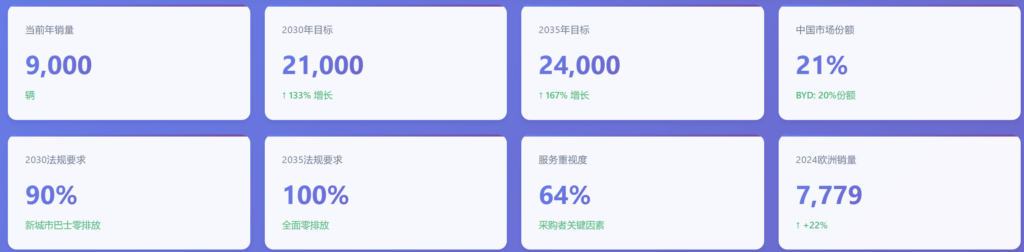 欧盟已经明确了时间表: 2030年90%的新城市客车必须为零排放,2035年达到100%。要实现这一目标,欧洲年销量必须从当前9000辆提升至2030年的21000辆,再到2035年的22000-24000辆。
