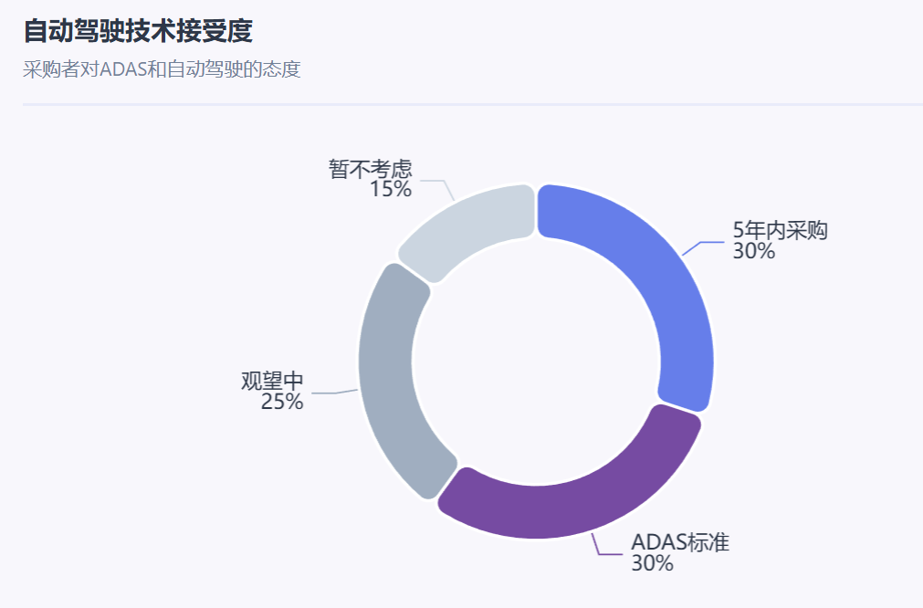 30%的采购者考虑在5年内购买自动驾驶客车,30%已将高级驾驶辅助系统(ADAS)作为主要选择标准。意味着自动驾驶正在进入商业化早期阶段。自动驾驶将带来新的客车形态:约20人的小型自动驾驶客车,用于固定路线、校园、园区等场景。这种新形态将改变城市交通的密度和灵活性,也对制造商的产品规划提出了新要求。