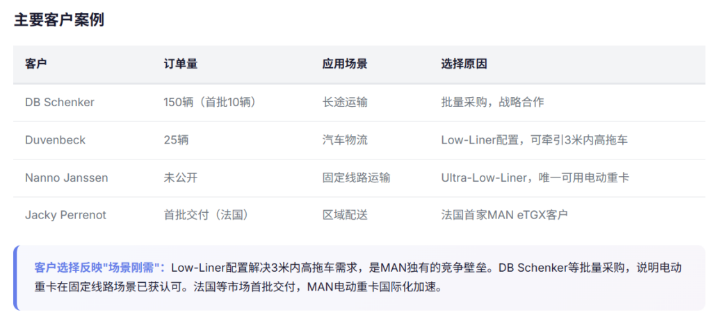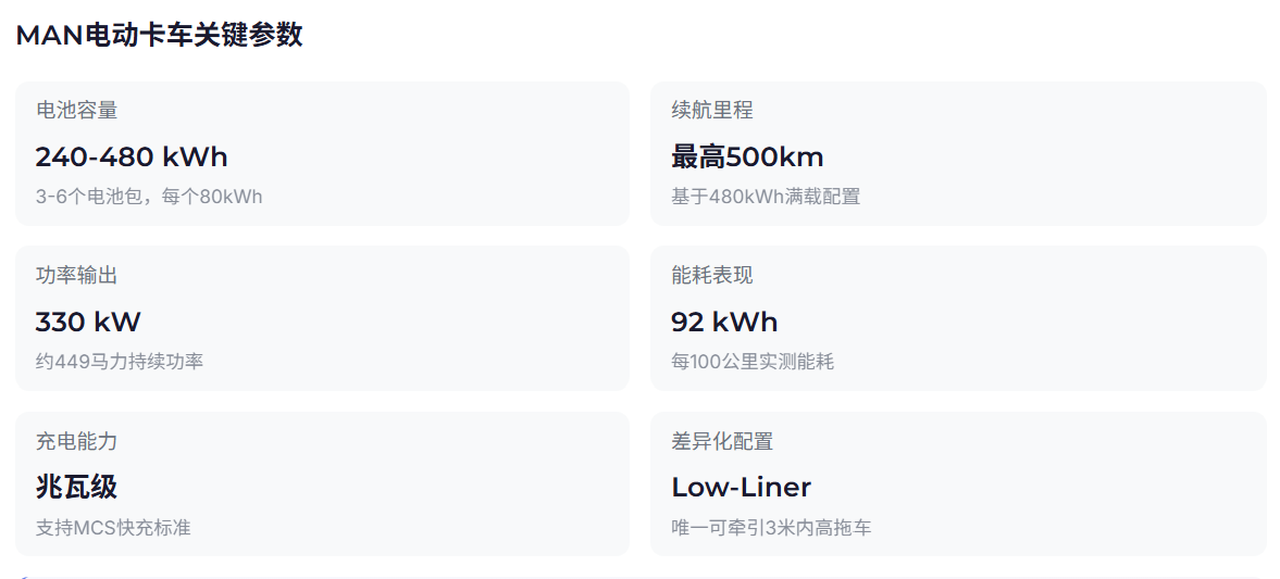 MAN eTGX是市场上唯一提供Low-Liner配置的电动重卡,可牵引3米内高的拖车。这个看似细微的产品差异,让MAN在汽车物流等专业运输领域形成了差异化竞争优势。德国物流公司Duvenbeck订购25辆MAN eTGX用于汽车制造商线路运输,另一家物流公司Nanno Janssen也因同样的Ultra-Low-Liner配置选择了这款车。实际运营数据显示,MAN eTGX能耗约为92 kWh/100公里,效率表现不错。