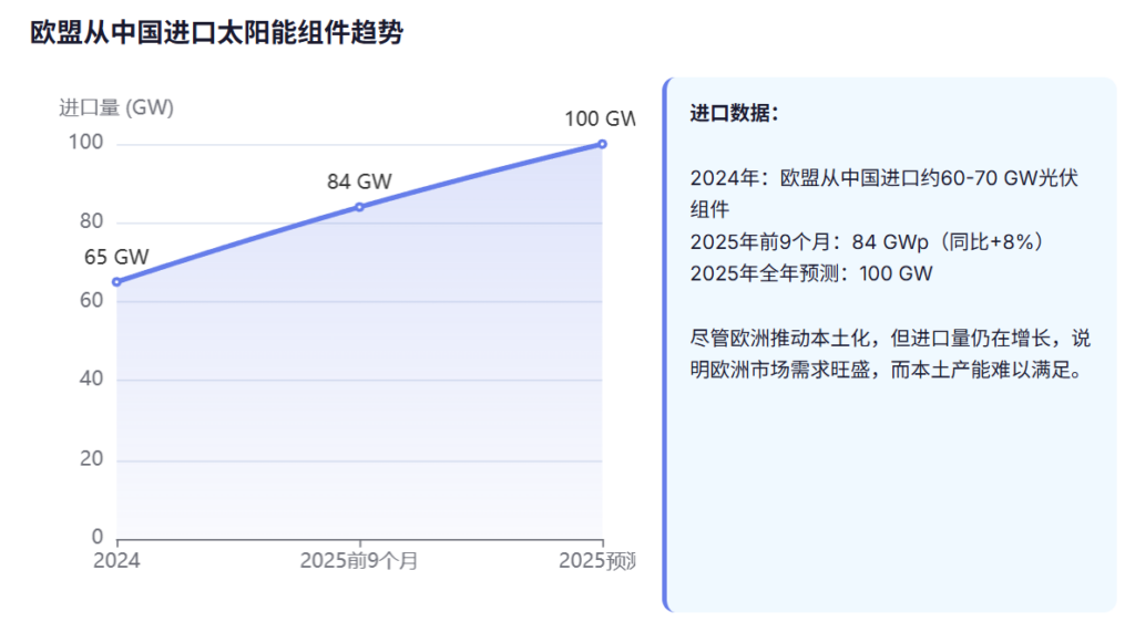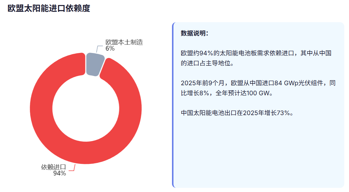 欧盟在全球光伏电池和组件制造产能中仅占约1%,约94%的太阳能电池板需求依赖进口。2025年前9个月,欧盟从中国进口约84 GWp光伏组件,同比增长8%,全年预计进口约100 GW。