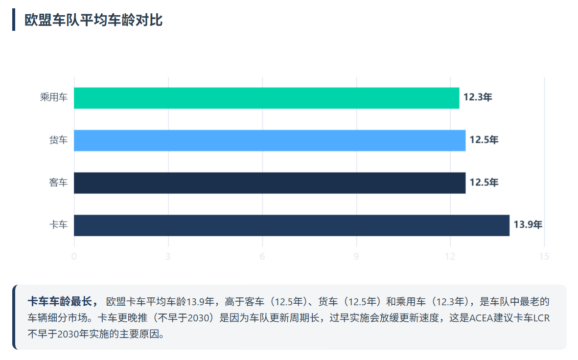 ACEA的第三个核心诉求,是针对不同车辆类型实施差异化时间表。对于卡车,ACEA建议不早于2030年逐步实施LCR。卡车的更新周期通常比乘用车长,欧洲卡车车队的平均车龄已经超过12年。如果过早实施LCR,车队更新速度会放缓,反而不利于减排目标的实现。