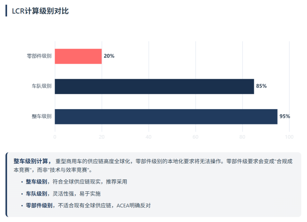 ACEA的立场很明确:零部件级别的定义不适合现有的全球供应链。整车级别计算是唯一可行的路径。欧洲商用车制造商在过去二十年里,已经构建了覆盖全球的供应链网络。戴姆勒卡车、沃尔沃集团、大众商用车、依维柯这些企业,在欧洲生产驾驶室和底盘,在巴西生产发动机,在印度组装整车,在北美销售。这种全球化布局本身就是竞争力。