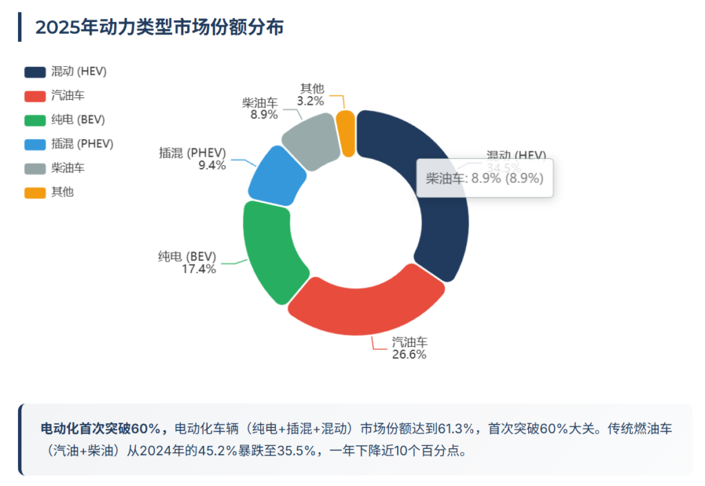 汽油车市场份额从33.3%降至26.6%,注册量288万辆,下降18.7%。柴油车继续萎缩至8.9%,注册量下降24.2%。两者合计从45.2%降至35.5%,一年下降9.7个百分点。背后的推动力来自三个维度: