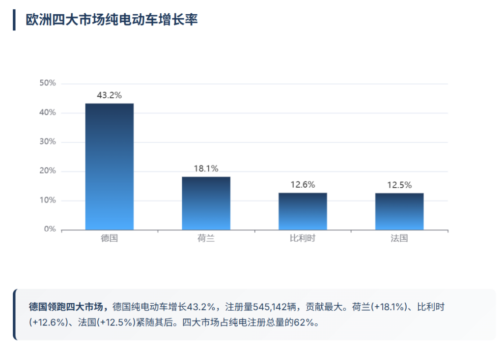 德国市场贡献最大,纯电动车注册量545142辆,增长43.2%。荷兰、比利时、法国分别增长18.1%、12.6%、12.5%。四大市场占纯电注册总量的62%,说明欧洲电动车普及仍集中在核心国家。