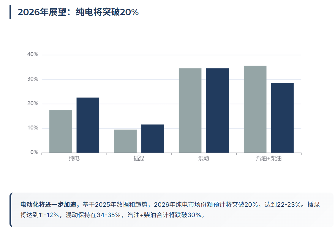 纯电方面,预计市场份额将突破20%,达到22-23%。主要驱动因素包括:更多纯电车型上市、电池成本下降、充电基础设施完善、消费者接受度提升。