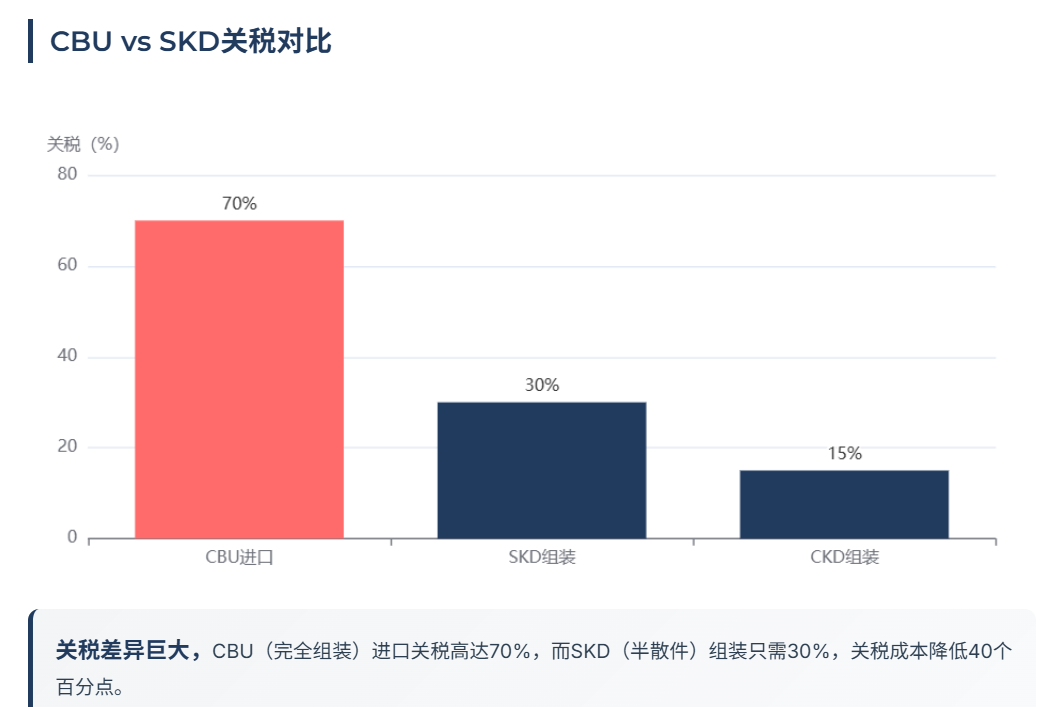 对政策与审批不确定性仍高的市场,SKD/CKD是更符合风险收益比的路径。2023年10亿美元建厂计划被拒后,比亚迪更谨慎,SKD成为平衡成本与审批速度的最佳选择。