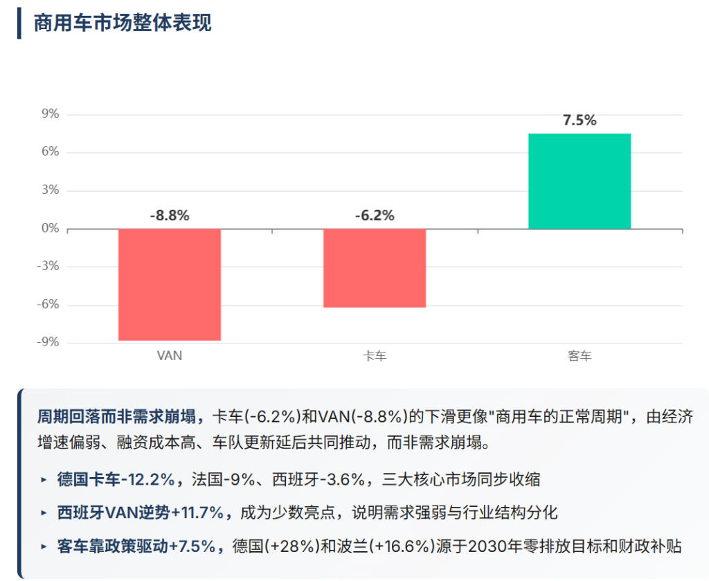 相比之下,客车成为唯一增长的细分市场(+7.5%),原因也是政策驱动的电动化替代。德国(+28%)和波兰(+16.6%)的强劲增长,背后是2030年城市客车零排放的政策目标和各国财政补贴支持。