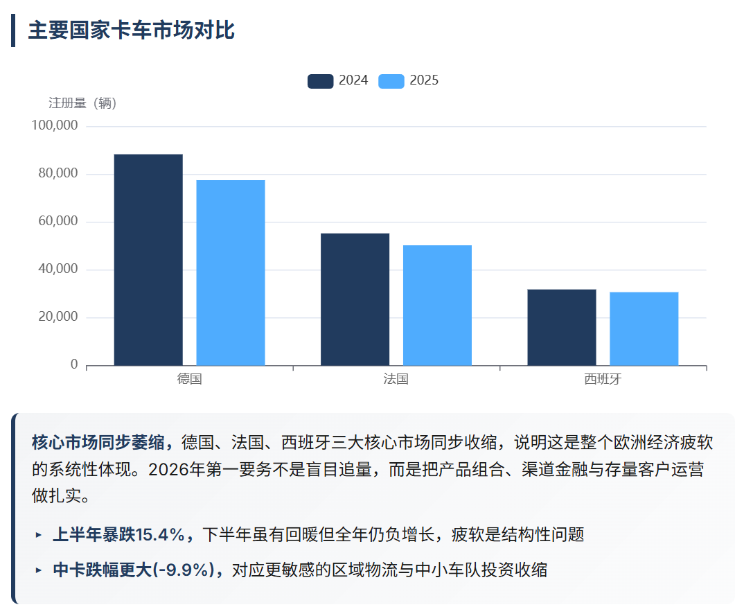 2025年欧盟商用车市场的下滑是欧洲经济疲软的直接体现。德国作为最大市场,卡车注册量从88240辆下降到77431辆,跌幅达12.2%。法国和西班牙分别下滑9%和3.6%。三大核心市场同步收缩,整个欧洲经济环境的系统性挑战。