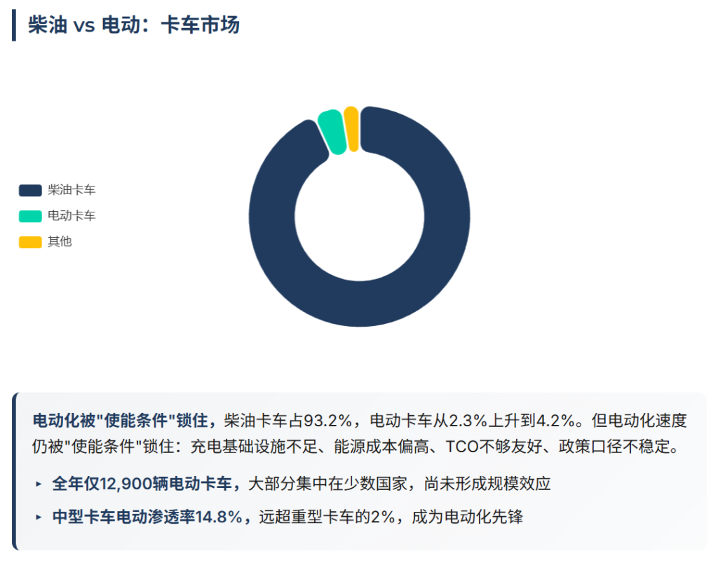 ACEA总结2025年是”充满挑战的一年”。这个评价既是针对传统商用车市场的下滑,也隐含了对电动化进展不够快的担忧。电动卡车4.2%的渗透率,12900辆的年注册量,大部分集中在少数国家。这种”孤岛式增长”意味着电动卡车尚未形成规模效应,供应链成本高,充电网络不完善,总拥有成本仍然高于柴油卡车。