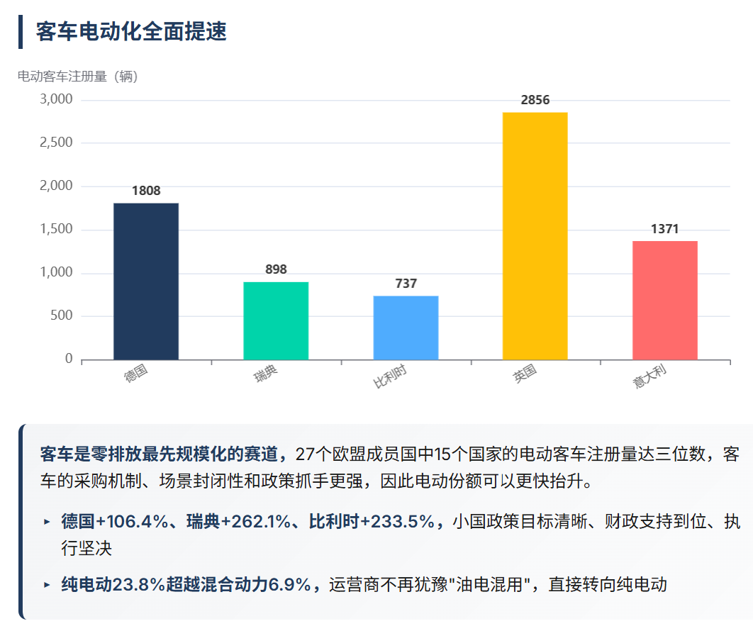 电动客车的表现更加亮眼,从18.5%跃升到23.8%。英国(2856辆)、德国(1808辆)、意大利(1371辆)的电动客车注册量均超过千辆,表明公共交通电动化已经从试点阶段进入规模化应用阶段。