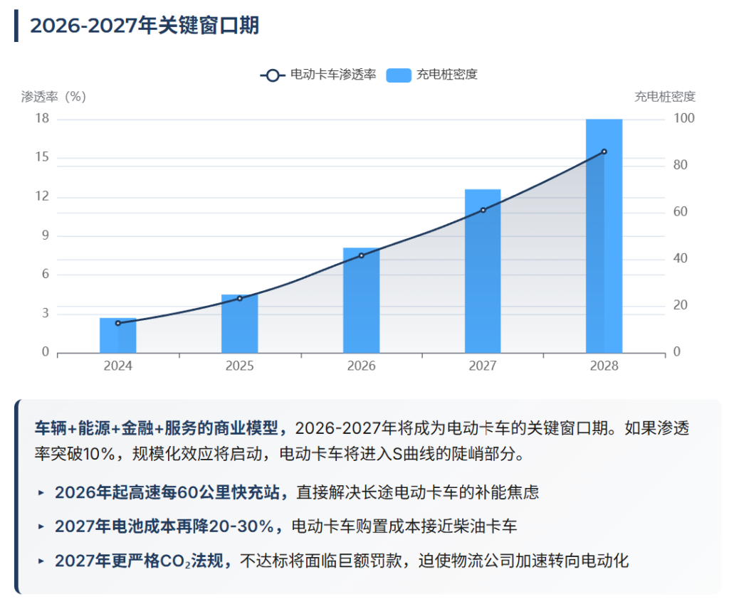 2026-2027年将成为电动卡车的关键窗口期。如果这两个电动卡车的渗透率能突破10%,那么规模化效应将启动,电动卡车将进入S曲线的陡峭部分。